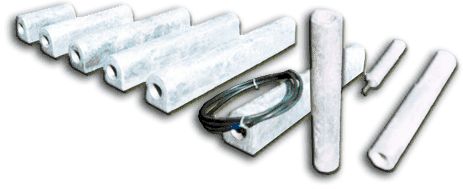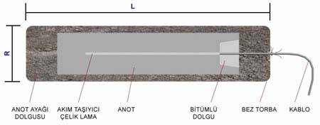 Toprak altında kullanılacak olan magnezyum anotlara standart olarak 3 metre boyunda 1x10 NYY tip ( veya istenilen boy ve ebatlarda ) yer altı bakır iletken kablo bağlanmakta, daha sonra magnezyum anotlar 75 % jips , 20 % bentonit , 5 % sodyum sülfat dolgu karışımıyla bez torbalara doldurulup, plastik poşetlere konulmaktadır.